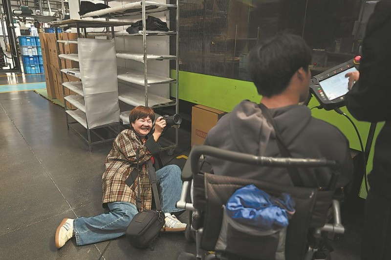 04月3日,长泰松霖智能家居厂房,徐妈坐在地上给正在学习智能智造设备操作方式的薛荣龙拍照。“这个角度太帅了!”施辰静 摄