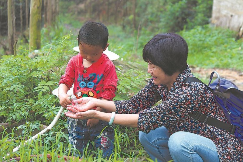 2016年4月27日,漳州市长泰区鼓鸣山,三岁的“小羊倌”小洪在徐智心的陪同下赶羊下山,并帮她冲水洗手。小洪自幼帮着残疾父母在山林里放羊,经过徐智心多年的走访帮扶,如今与她相处如亲人。陈少伟 摄